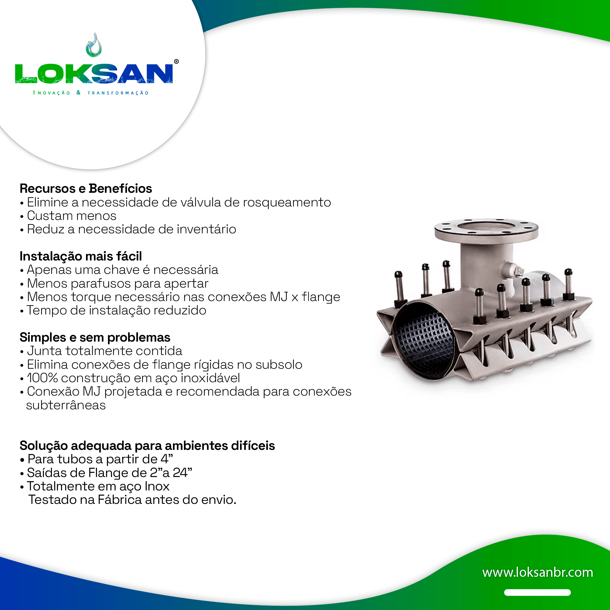 Indicado para tubos a partir de 4″, com saídas flangeadas de 2″ a 24″, conta com junta totalmente contida e conexão MJ recomendada para instalações subterrâneas, reduzindo necessidade de inventário e eliminando a dependência de válvula de rosqueamento. Testado em fábrica antes do envio.